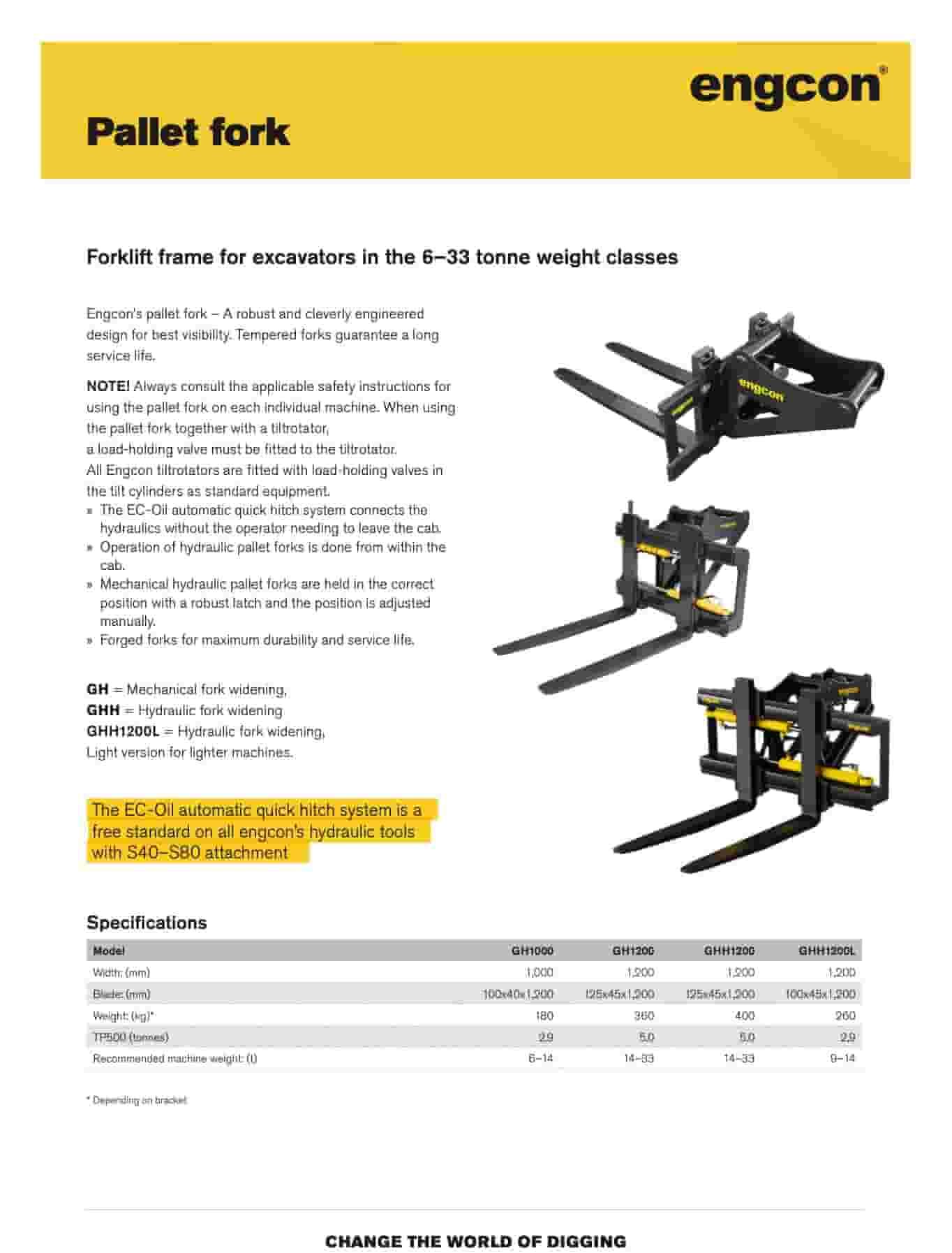 4–33 tons. Designed for durability and visibility, the forks allow operators to safely handle pallets, materials, and equipment directly from the excavator.