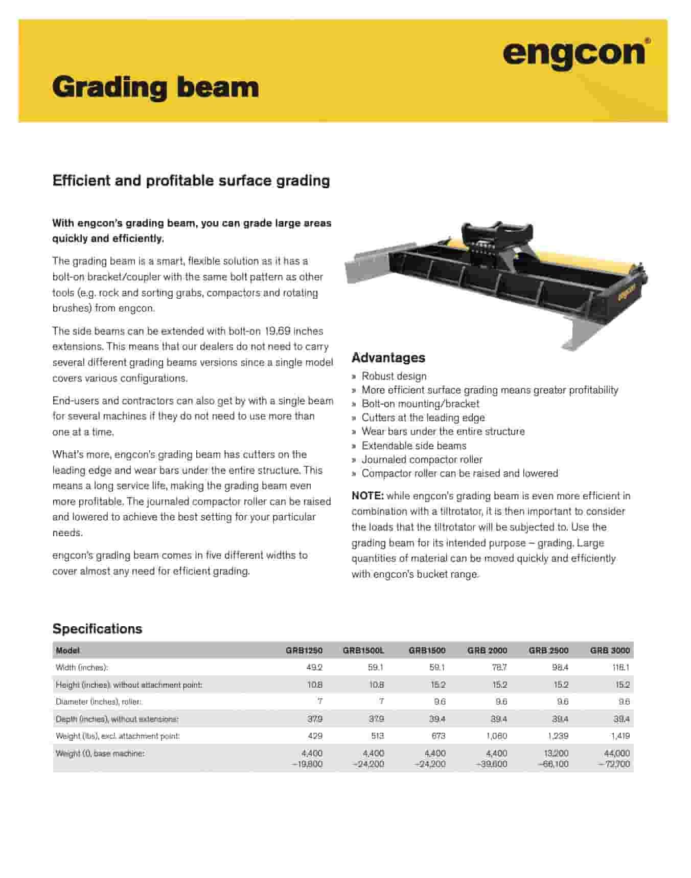 bolt-on bracket system, the grading beam shares the same bolt pattern as other Engcon tools such as rock grabs, sorting grabs, compactors, and rotating brushes. This allows quick interchangeability and flexible machine setups.