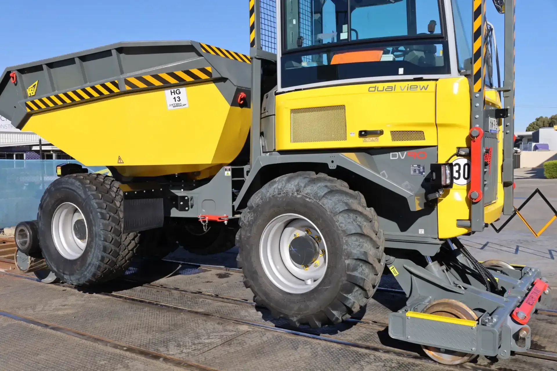 Retractable rail wheel assemblies installed on the dumper positioning the vehicle on the rail, allowing the rear tyres continue to provide traction and braking, whilst providing train stop clearance. The rear end has a mechanical twist mechanism to suit the rail regulator’s requirements. All four rail wheels are fitted with park brakes to prevent “run aways”, as well as service brakes to make the unit more agile & productive.